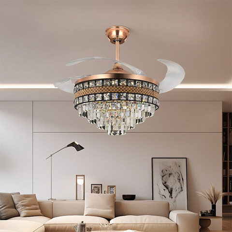 Stile di lusso casa interna sala da pranzo 36 42 48 pollici telecomando oro nero luce di cristallo retrattile con lampada a ventaglio
